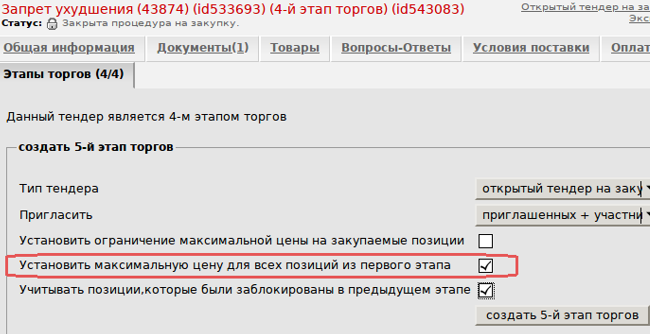 Теперь при формировании второго и последующих этапов на вкладке «Этапы торгов» можно воспользоваться удобной опцией: «Установить максимальную/минимальную цену для всех позиций из первого этапа». В этом случае установленные в первом этапе максимальные/минимальные цены автоматически переносятся в очередной этап вне зависимости от наличия или отсутствия ценовых предложений.