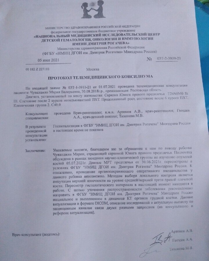 Когда Маше было год, родители заметили небольшую шишку на её руке, пошли с этой проблемой в районную поликлинику, оттуда их направили в Краснодар, где сначала поставили диагноз гемангиома и направили на операцию. В ходе операции хирург поняла, что это не гемангиома и зашила всё обратно, отправив материалы и часть опухоли в Москву, а уже там Маше поставили диагноз саркома Юинга.