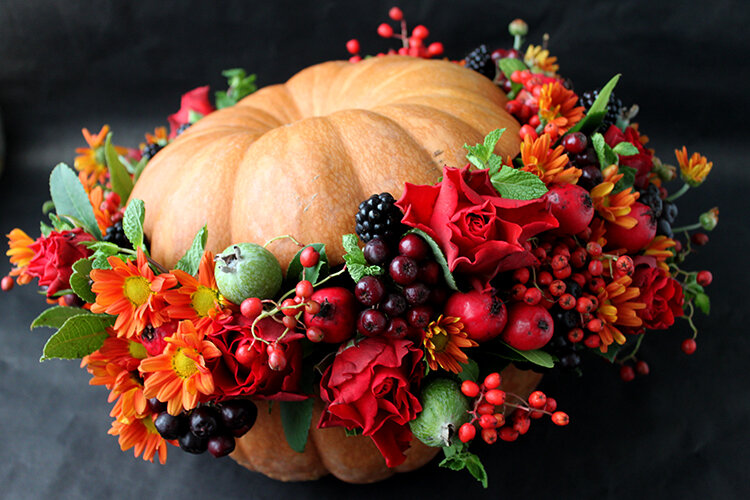 Декоративная тыква - это твёрдая структура, разнообразие оттенков, форм и фактур, гладкая поверхность. Хеллоуин - отличный способ, чтобы украсить помещение, преподнести в подарок или порадовать свой дом и себя креативной композицией из декоративной тыквы. Варианты применения декоративной тыквы: • композиция на стол •оформление выездной церемонии •подсвечники •фотозона Чтобы сделать оформление тыквы ещё более интересной и атмосферной, окрасьте ее. Для этого подойдут акриловые краски. ФЛОРИСТИЧЕСКАЯ КОМПОЗИЦИЯ В ТЫКВЕ: