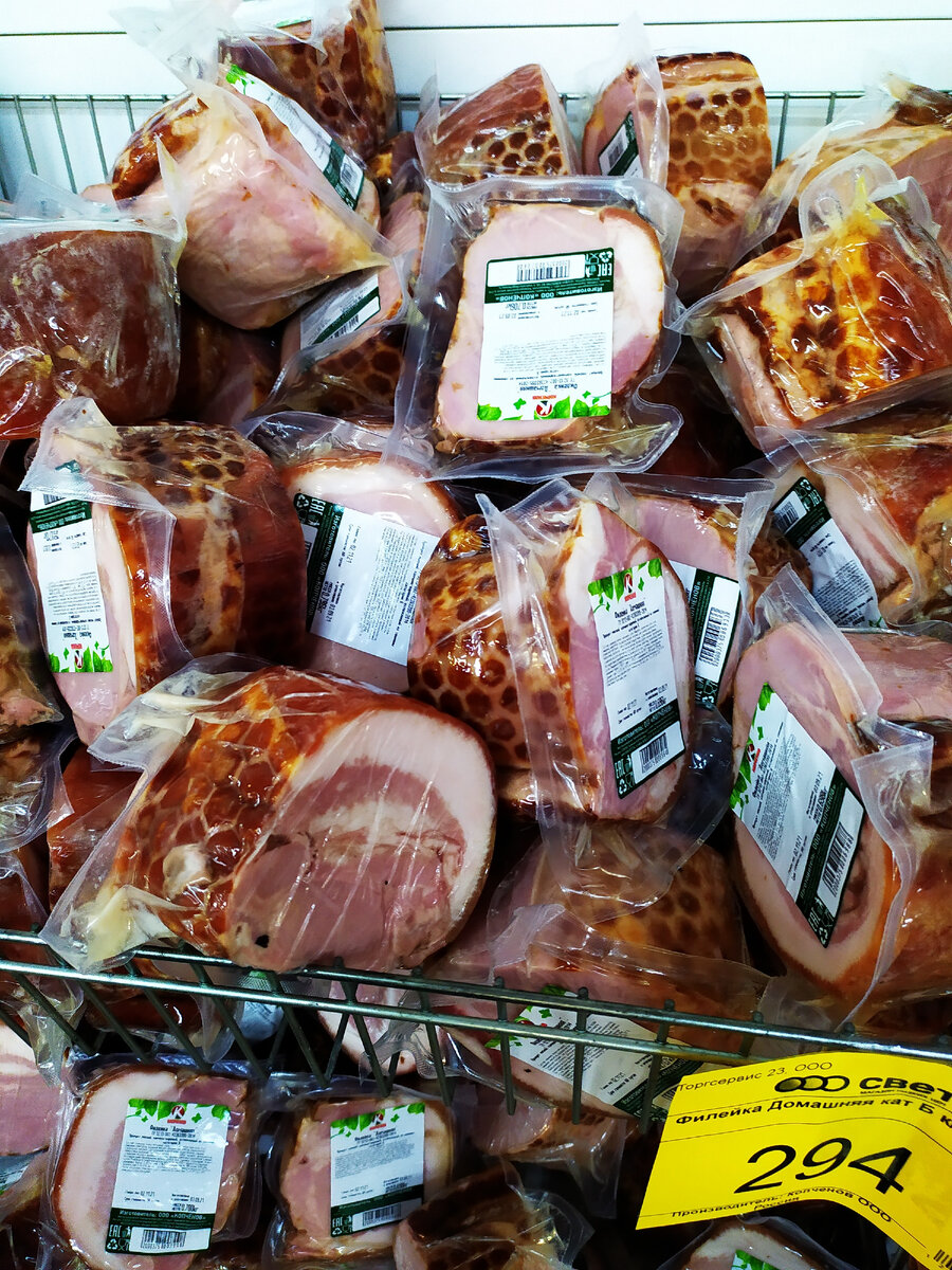 Несколько полок просто завалены Домашней филейкой" в вакуумной упаковке. Цена 294 рубля за 1 кг.