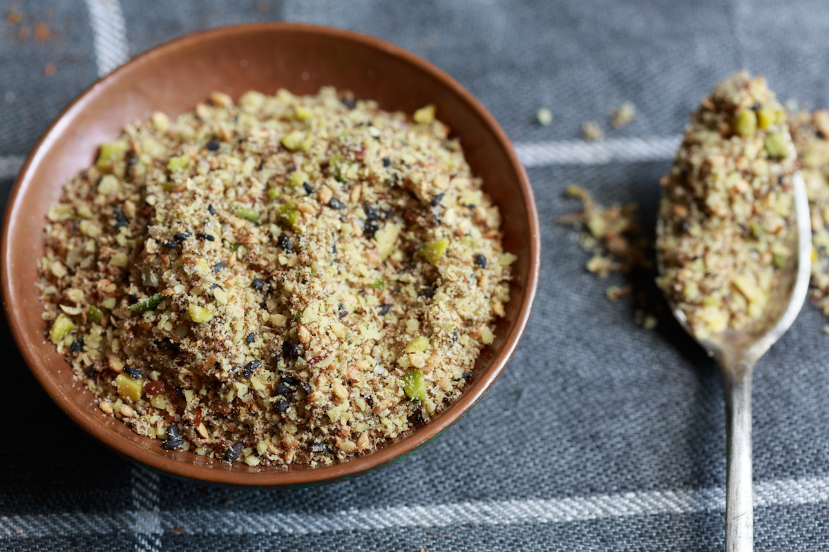 Приготовление простейшее: всё вместе, или по отдельности (как вам удобнее), кроме трав и соли с перцем, обжариваем на сухой сковородке, предварительно порубив орехи ножом. Я жарю отдельно, чтоб точнее уловить ароматы. Всё ссыпаем в одну миску и пару раз вжикаем блендером (чтоб получилась смесь, похожая на пшенку), добавляем растёртые сухие травы, соль, перец красный и черный, перемешиваем и пересыпаем в сухую стеклянную банку. Банку закрываем пергаментом, стягиваем резиночкой для денег (не нужно использовать капроновые крышки). В холодильнике хранится 3-4 недели и, кстати, придаёт всем продуктам непередаваемый аромат Востока))