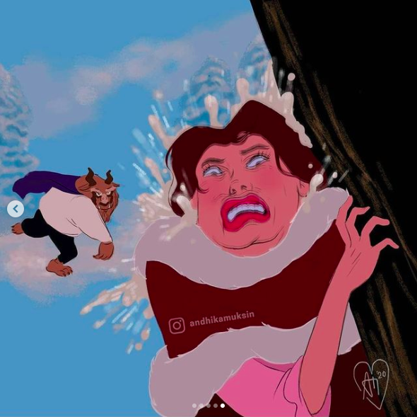 Ну, привет-привет, ребятЫ! Захотелось в начале недели поржать и поэтому этот материал напросился сам собой! Я уже как-то делился артами Andhika Muksin на канале. Решил еще раз про нее рассказать, а то уж больно её иллюстрации мне понравились. Ну точнее не рассказать, а показать творчество художницы. На этот раз я подобрал прям самые яркие и самые угарные арты! Судя по ним, художница прям разошлась на полную катушку и выплеснула весь креатив! И знаете, мне это даже нравится! Потому что иногда Диснеевская ванильность кажется уж слишком рафинированной, так что можно иногда над ней и подшутить! Но не думаю, что все помнят статью по артам этой художницы, поэтому от слов перехожу уже к демонстрации. Тут не будет "разгона", я сразу начну показывать супер смешные картинки! Ооо! Как же я тащусь с этих артов! Ну точнее я не могу сказать, что они мне нравятся и это прям любимый стиль, но все же в них есть что-то такое, что притягивает взгляд! И я даже знаю что! Ведь по сути, принцесс Диснея еще
