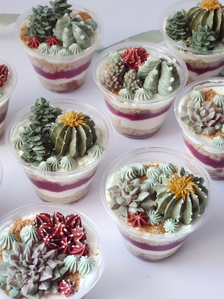 104 - для больших кактусов. Делаем цилиндрическое основание, а затем вдоль основания сверху вниз делаем движения насадкой, создавая ребра кактуса. 1 или 2 - для иголочек. Аккуратно делаем точки на рёбрах кактуса. 104, 80 или 59 - для цветочков на кактусе. Маленький цветок можно сделать даже без насадки, отрезав от мешка уголок 1мм. 350 или 352 (листик) - для суккулентов. Чтобы сделать эчеверии нужно отсадить листики по кругу, начиная от периферии, заканчивая в центре. Для крассулы Перфората отсаживаем листики в столбик крест-накрест. 3, 4 или 5 для седума.