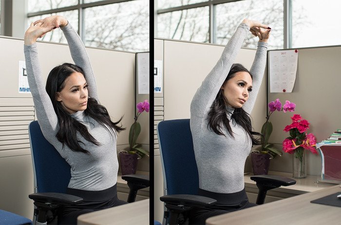 - Останьтесь в положении сидя на стуле. Руки положите на бедра или пояс. Распрямитесь по всей протяженности корпуса от макушки до таза, не прогибая поясницу. Для устойчивости установите стопы полностью на пол. Теперь согните правую руку перед собой, расположив ладонь на затылке. Из принятой позиции наклоните голову за счет легкого давления по диагонали в правую сторону. Задержитесь, под кистью ощущайте небольшое противодействие. Аккуратно вернитесь назад. Без длинной паузы поменяйте руки и повторите наклон влево. Хорошо укрепляется верх корпуса, работают в этом упражнении сидя на стуле мышцы шеи и трапеции.