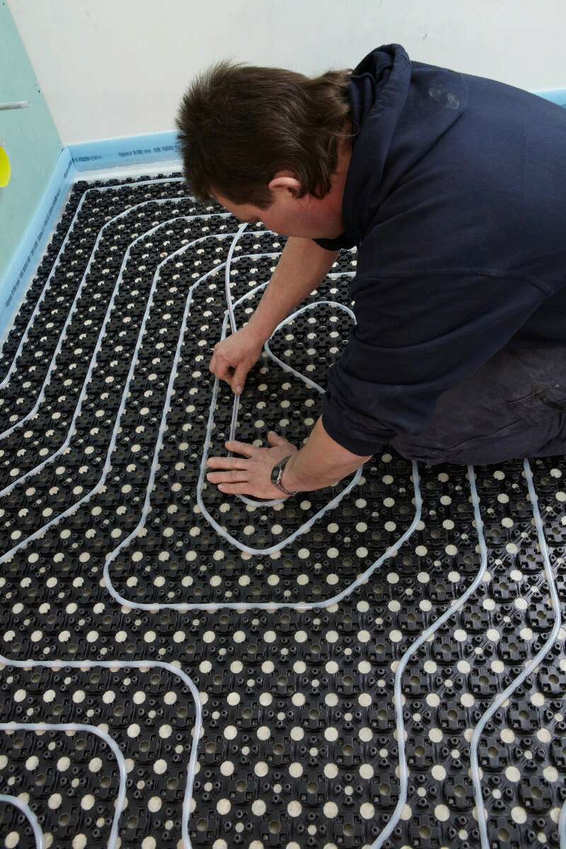 На сегодняшний день бетонная система водяного теплого пола наиболее распространенная.Трубы контуров закрывают бетонной стяжкой. Технология монтажа включает следующие этапы: 1. деление помещения на участки до 40 м квадратных; 2. покрытие изоляционным материалом черновой поверхности; 3. укладка арматуры и монтаж контуров труб; 4. проведение опресовки системы отопления; 5. бетонная стяжка; 6. укладка чистового покрытия. 1. Помещение делят на участки,количество которых зависит от площади и геометрии помещения.Площадь одного участка не должна быть более 40 квадратов,а соотношение сторон-не менее 1:2.Это связано с тем,что под воздействием температурных изменений стяжка будет расширяться. 2. Предварительно очищенное основание покрывают изоляционными материалами,чтобы избежать потерь тепла.Наиболее распространенным таким материалом являются пеноплекс и полистирол.Плотность изоляционного слоя должна быть не меньше 35 кг/м квадратный,а толщина 30-150 мм. Затем по периметру и между сек