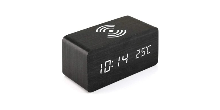 На экране будильника отображается текущее время и температура в помещении. Сверху расположен модуль беспроводной зарядки.