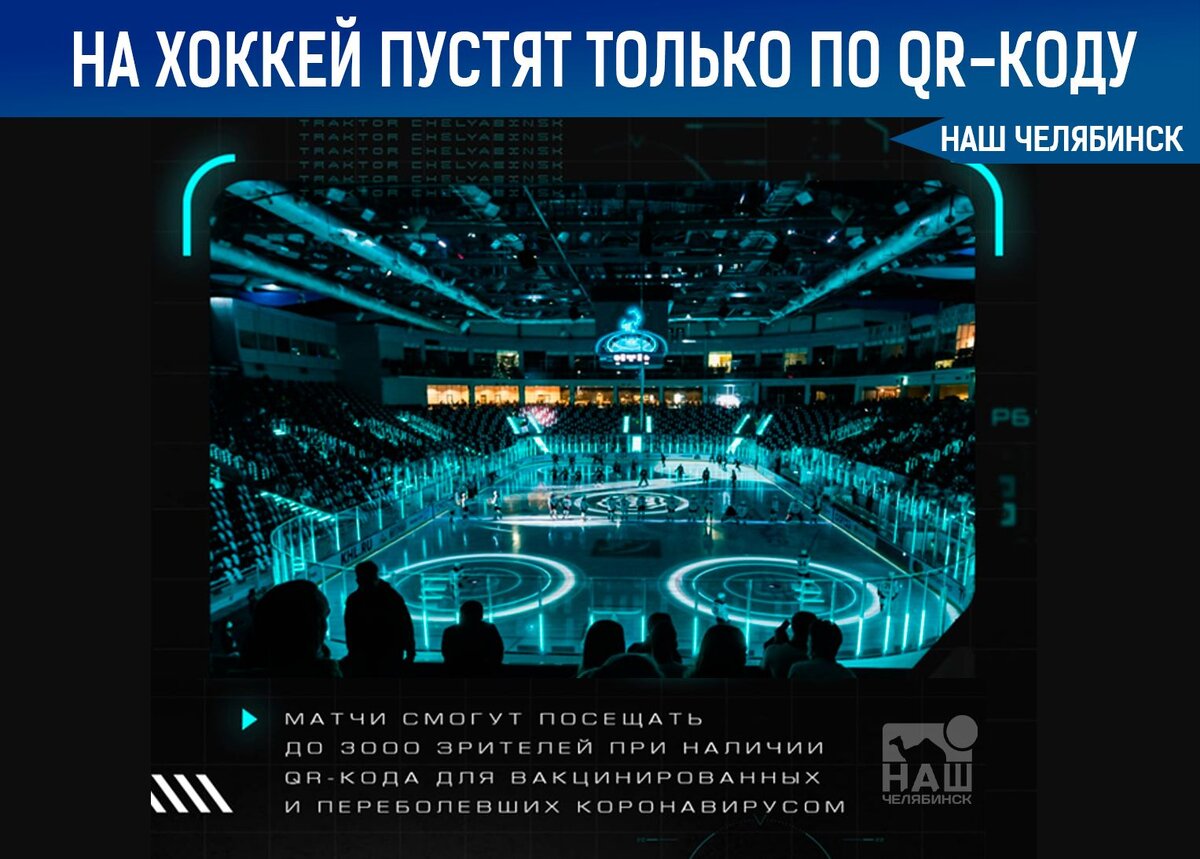🏒 Для челябинских болельщиков «Трактора» введены новые правила 👉 На домашние матчи хоккейного клуба «Трактор» в Челябинске зрителей будут пускать при наличии QR-кода, подтверждающего наличие прививки или факт перенесенного COVID-19 за последние полгода. Такое решение принял 21 сентября оперативный штаб региона по противодействию распространению коронавирусной инфекции, сообщили URA.RU в пресс-службе правительства области. Тем, кому не исполнилось 18 лет, наличие QR-кода не потребуется. 💬 «Число зрителей в ледовой арене „Трактор“ в Челябинске будет увеличено до 3 тысяч человек, в три раза. При наличии неподтвержденного QR-кода (или его отсутствии) и валидного билета клуба болельщику в доступе на арену будет отказано, с возможностью возврата билета. Для гостевых фанатов и фанатов клуба также обязательно наличие действующих QR -кодов», — уточнили в пресс-службе. По материалам ura. ru