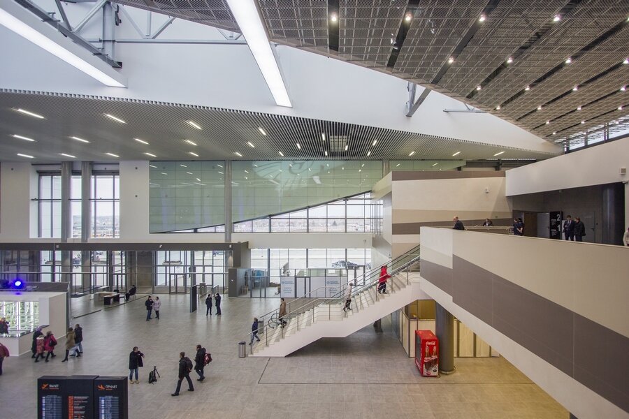 Новый терминал реконструирован в соответствии с международными стандартами. Он занимает 2 этажа. Большое Савино рассчитано на приём до 2 миллионов пассажиров ежегодно. Для этого работают 4 багажные линии и 20 стоек регистрации. Каждый человек может купить билет на рейс онлайн. Одним из ключевых аспектов при реконструкции стала забота о людях с ограниченными возможностями. Для них доступны различные услуги: Инфраструктура В международной и внутренней зонах в терминале имеются две стойки упаковки багажа. Они работают круглосуточно. Упаковка производится своими силами. Цена за обмотку плёнкой составляет 500 рублей. Работает камера хранения. В ней можно оставить как мелкогабаритный, так и крупный багаж. Стоимость ячейки взимается за сутки и составляет 350 рублей. В аэропорту действует комната матери и ребёнка. Внутри находятся пеленальные столики, спальня с кроватями, кухня с холодильников и микроволновой печью. Медицинский пункт расположен в левой части, рядом с камерой хранения. Специ