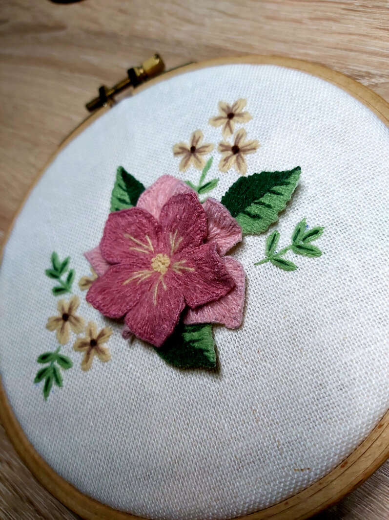 За прошедшие несколько дней я вышила небольшой цветочный дизайн только нитками Cloud! Вот какой он получился Это объемная вышивка гладью с пришивными элементами - крупные лепестки цветка и листья вышиваются отдельно, я вышивала в 1 нитку на водорастворимом флизелине (можно на фатине, органзе), затем пришила на уже выполненную вышивку, очень хотелось попробовать такой способ. Скажу сразу для украшения одежды этот способ с применением водорастворимого флизелина не годится, одежду хоть иногда приходится чистить (стирать!) и вы понимаете что может произойти, для таких работ больше подходит вышивка на фатине или органзе. Но охота пуще неволи, очень хотелось вышить на водорастворимом флизелине! Делюсь своими впечатлениями. Нитки хорошо укладываются на ткань, такое чувство, что вышиваешь шерстью, нитки прочные - не рвутся, не ползут, немного скручиваются (как впрочем все нитки), нужно следить и переодически раскручивать. Еще один важный момент - какой иглой вышивать. Я вышиваю иглами для ру