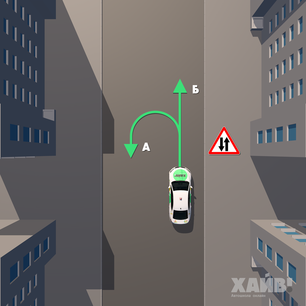 Предупреждающий знак 1.21 устанавливается за 150-300 (50-100) метров до начала участка с двусторонним движением. Значит, учебный автомобиль все еще движется по односторонней улице. Поэтому дальнейшее движение возможно только по траектории Б.