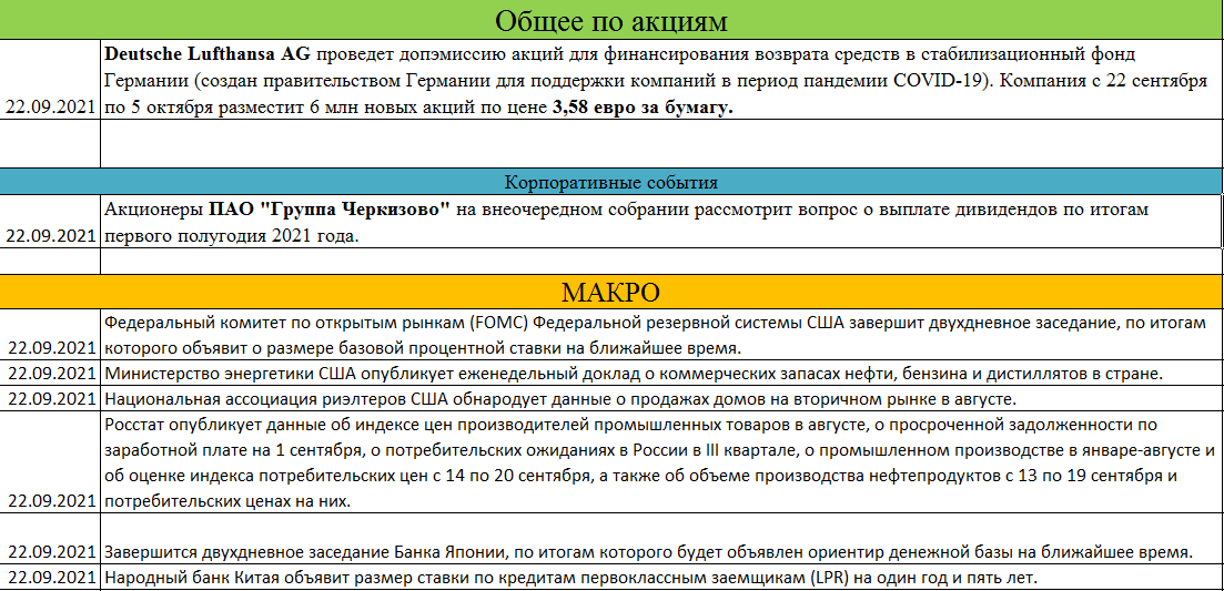 Из предстоящих событий, акционеры Черкизово могут утвердить дивиденд в 85,27 руб (доходность выплаты 2,7%) и допэмиссия в Deutsche Lufthansa AG по цене 3,58 евро за акцию.