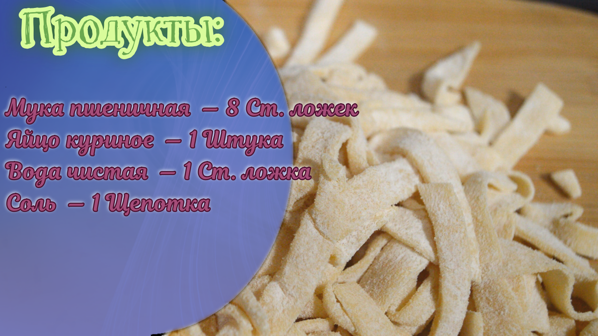Здравствуйте, сегодня покажу как я готовлю лапшу по домашнему. Такая лапша подойдет практически для всех супов, бешбармака и множества вкуснейших блюд разного направления. Если вам лень читать, то вы можете посмотреть этот видео-рецепт: Для приготовления домашней лапши нам понадобится совсем не много продуктов: Основой лапши конечно является правильно приготовленное тесто. Через сито просеиваем муку, что бы она стала воздушной и напиталась кислородом фото листать вправо ›››››››››››››››› Далее в муку добавляем одно яйцо, одну столовую ложку теплой воды и соль Замешиваем наше тесто. По мере замешивания добавляем либо муки, либо воды. Тесто должно получиться упругим, не липким. Даём отдохнуть нашему тесту буквально 15-20 минут фото листать вправо ›››››››››››››››› Далее раскатываем тесто, толщина пласта не должна превышать 2 мм. Нарезайте тесто так как вам захочется, смотря для какого блюда вы его готовите: - если для куриного супчика, то это должны быть полоски длиной 5 см., а шириной