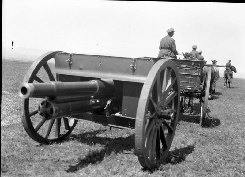 Имелись так же трёхдюймовые горные пушки обр. 1909г. , часто из – за небольшого веса использовавшихся в конной артиллерии . Боевая масса – 627кг , походная масса – 1236кг , дальность стрельбы – 8660 кг , вес снаряда – 6, 23 кг .
