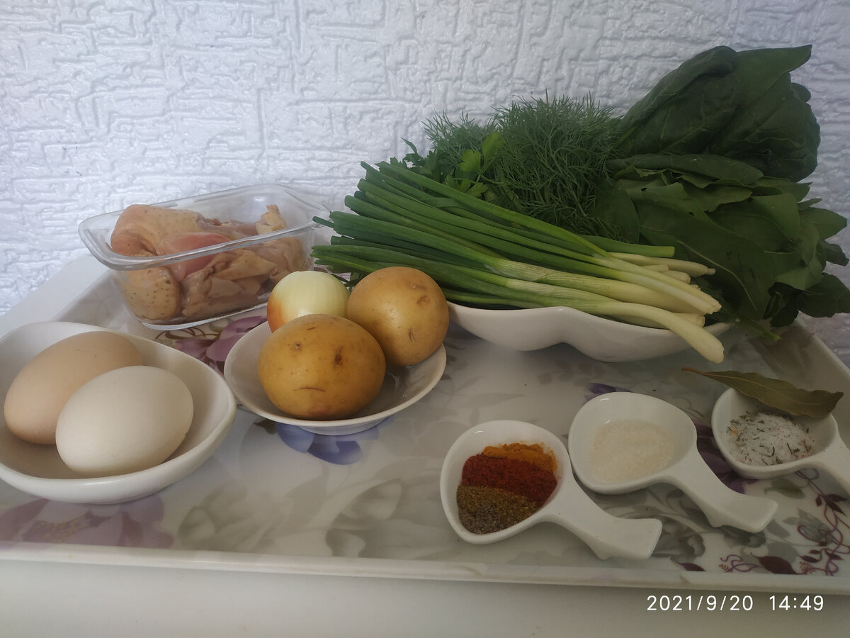Ингредиенты: для приготовления зеленого борща Курица домашняя - 300-350 гр. Щавель - 1 большой пучок Шпинат - 1 пучок Зеленый лук - 2 пучка Укроп, петрушка - небольшой пучок Картофель - 2 шт. Лук репчатый - 1 шт. (+1 шт. в бульон) Морковь - 1 шт. в бульон Корень сельдерея (или стебель сельдерея) - кусочек (или 1 стебель в бульон) Соль - 1 ч. л. Сахар - 0,5 ч. л. Специи: куркума, паприка, хмели-сунели, черный перец молотый - по желанию и предпочтению Готовим бульон Курицу хорошо моем, закладываем в кастрюлю, заливаем водой, ставим на огонь Когда бульон закипит, снимаем пенку, убавляем огонь до небольшого кипения. Добавляем луковицу, морковь, кусочек корня сельдерея, перец душистый и цветной горошком. Варим курицу 30 минут. Курицу вытаскиваем из бульона и отделяем от косточек. Бульон процеживаем. Подготовленные продукты для зеленого борща Бульон с курицей отварили Щавель и шпинат порезали не очень крупно Лук и зелено - порезали мелко Яйца отварили вкрутую Картофель - порезали мелким б