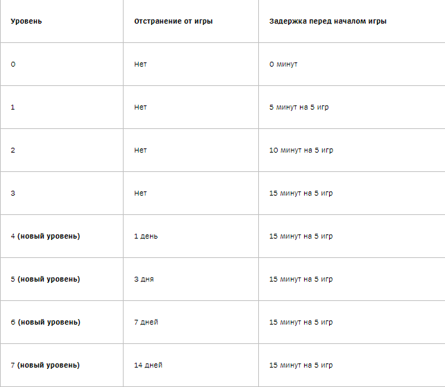 Riot вводит новое наказание для тех, кто продолжает бездействовать: отстранение от игры. Представьте, что это задержки на максималках. В этом случае у игрока появляется всплывающее окно с описанием наказания, и он отстраняется от игры в очередях MOBA. Мы уже не спрашиваем нарушителя: "Видишь, как отстойно тратить время впустую?", а полностью изолируем его от других игроков, чтобы он не мог портить им игры. Когда срок отстранения от игры истекает, перед началом матча игрок получает задержки максимального уровня. Мы не хотим, чтобы нарушители просто пережидали наказание; мы все еще надеемся изменить их поведение. Отстранение от игры распространяется на все очереди MOBA. Важное примечание: уровень нынешних злостных нарушителей будет сброшен до 3-го. Они получат шанс исправиться, прежде чем заработает система отстранения от игры. В этой таблице приведена подробная информация обо всех уровнях наказаний Уровень наказаний не снижается со временем. Лучший (вернее, единственный) способ его сни