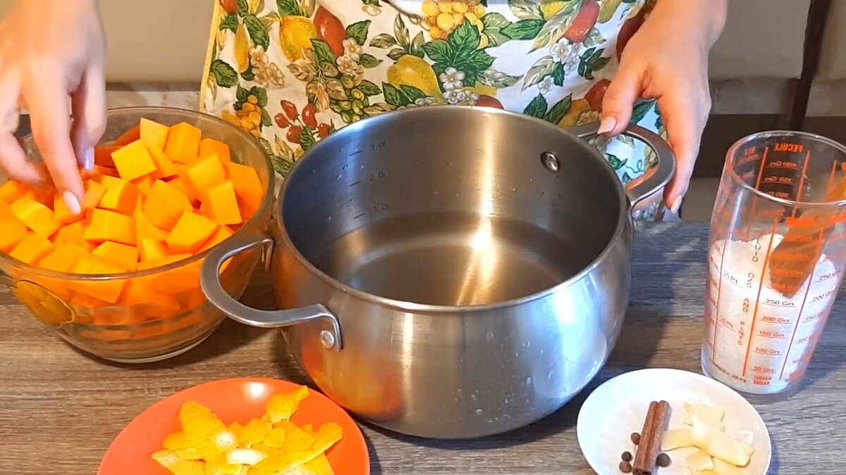 Всем огромный привет! Ну кто же не слышал о пользе тыквы? Все слышали, все знают, но далеко не все любят 😊 Ну и уж точно употребляют ее не каждый день. Ну а я занялась тем, что хочу изучить и приготовить как можно больше рецептов из тыквы, чтобы кормить свою семью не только полезно, но и вкусно! И так как у меня все любят салат с курицей и ананасом, а ананасы все дороже и дороже, я решила сделать ход конем и приготовить тыкву как ананас 😊 Тут и экономия бюджета и польза для организма 😊 Итак, начинаем превращать тыкву не в карету, а в ананас! Подробности вы можете посмотреть в этом коротком видео: Что же нам понадобится: Способ приготовления: Шаг 1: Тыву очищаю и нарезаю кусочками примерно 2 на 2 см. С лимона снимаю кожуру и выдавливаю сок. И кусочками нарезаю корень имбиря. Шаг 2: Теперь подготовлю маринад. В воду насыпаю сахар, все необходимые специи, имбирь, цедру лимона и ставлю на огонь, чтобы все закипело. Шаг 3: Когда маринад закипел, добавляю в него уксус и сок лимона, а такж