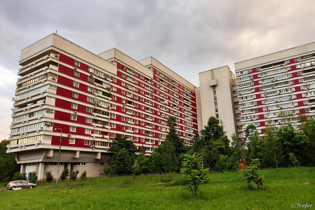 Жилой комплекс "Кардиолог", построенный в середине 1980-х для работников Всесоюзного кардиологического научного центра Академии медицинских наук СССР. Это был очередной эксперимент. Корпуса поделены на секции, по первому этажу можно перейти из одного подъезда в другой, не выходя на улицу, свободные планировки и двухэтажные квартиры. Ничего не напоминает? В комментариях к публикации про экспериментальный район Северное Чертаново рассказали про этот дом. Планировалось, что Крылатское будет застроено по такому же проекту. Но что-то пошло не так, и Чазовский дом остался единственным среди типовых панельных серий. Кстати, почему Чазовский? Откуда такое название? Это по фамилии академика Чазова, директора того самого кардиологический центра. Просто народное название. Комплекс состоит из двух частей, которые имеют разные адреса: Подъезды в свою очередь делятся на секции. Под окнами бетонные ящики для цветов. Имеется подземная парковка. Туда можно попасть прямо из дома. В современных жилых ком