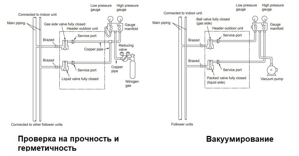 Инструкции производителей предписывают производить опрессовку и вакуумирование системы через сервисные штуцеры на обоих запорных вентилях - жидкостном и газовом.
