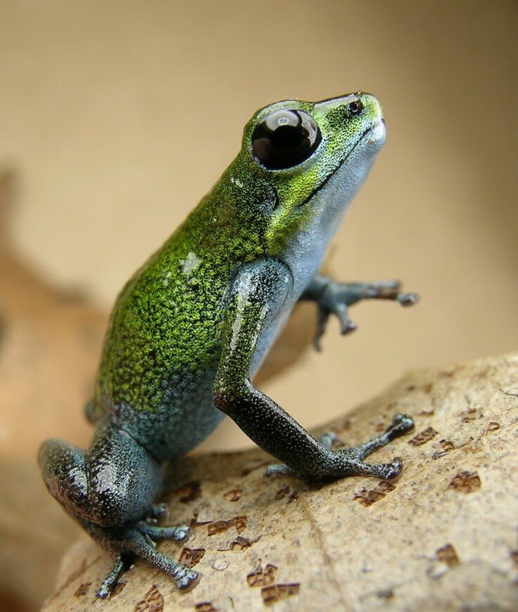 Frogs are amphibians. They lay their eggs in the water, where tadpoles hatch, which live in the water until they turn into an adult frog. Tadpoles are more like fish than frogs, they have ribbed tails and breathe through their gills. Although frogs live on the ground, their habitat should be near swamps, ponds or in wet places, because they will die if their skin dries out. Frogs breathe through their nostrils, and also absorb some of the air through their skin. Frogs use their sticky tongue to catch and swallow food. Frogs can look forward, sideways and up at the same time. They never close their eyes, even when they are asleep. It is noteworthy that frogs actually use their eyes to swallow food. When the frog blinks, its eyeballs press on the upper palate, helping to push food into the throat.