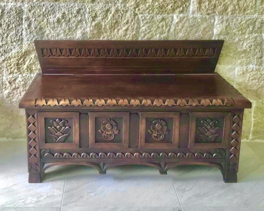 Скамья деревянная резная с сундуком по проекту русского архитектора и художника С.В. Малютина в исполнении наших мастеров.
