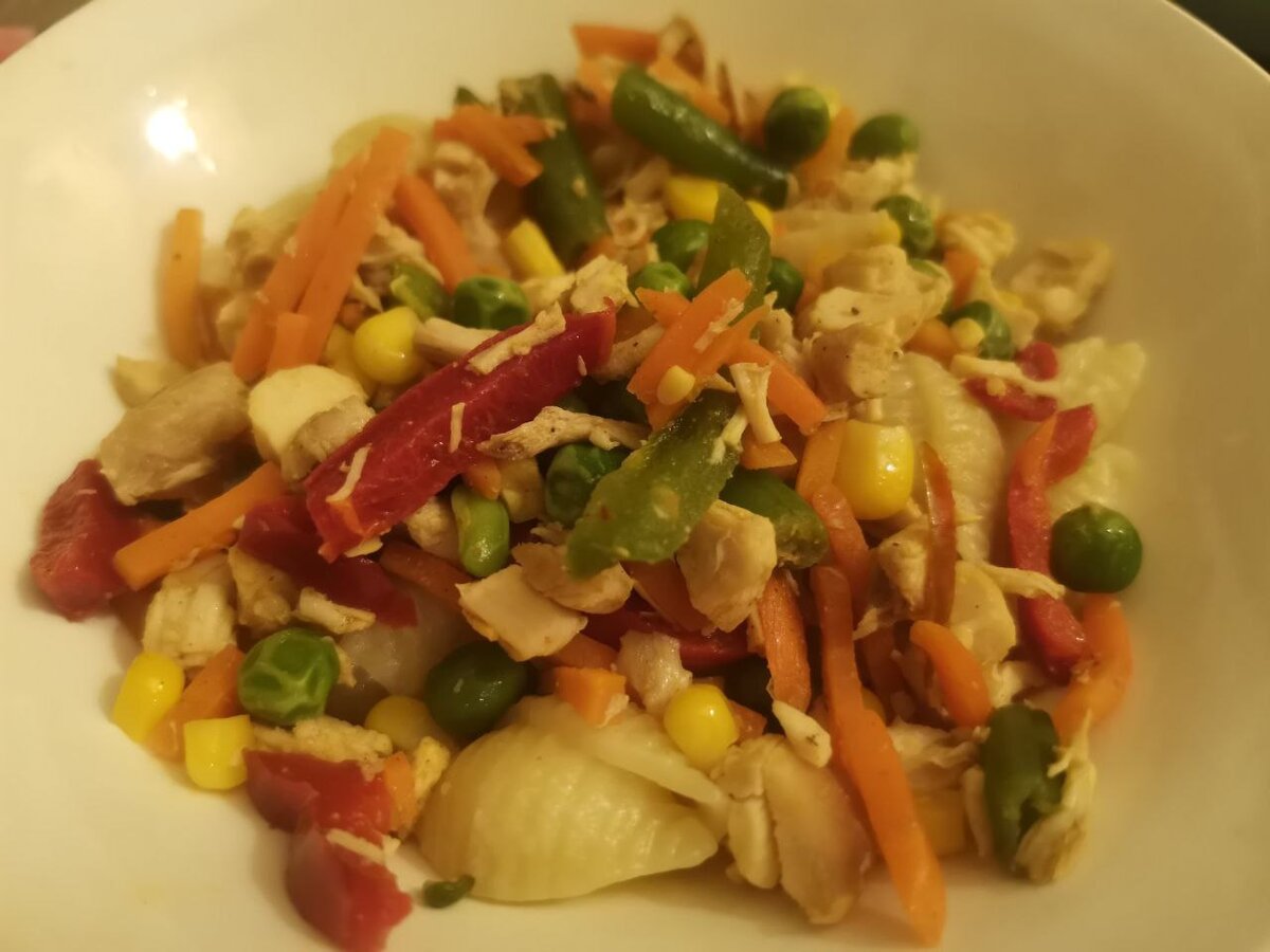 Когда уже не знаешь, что приготовить) Быстрый ужин Надо: Замороженные овощи Варёная курица Макароны Специи Приготовим: Варим макароши (надеюсь все знают как 😉) На сковородку выкладываем овощи, жарим Шинкуем курицу и добавляем в овощи, жарим В конце специи добавим и ужинаем🍛