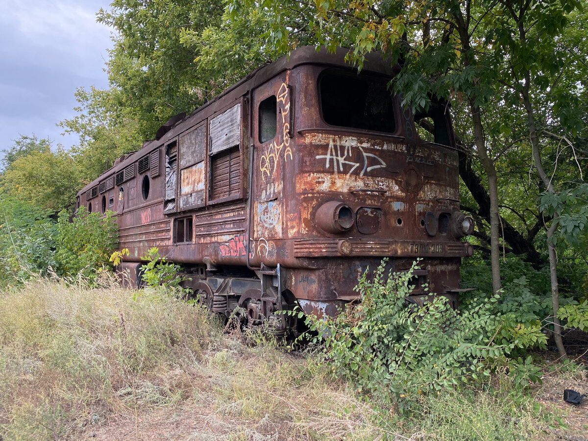 Это необычное место скопления железнодорожной техники на спутниковой карте и в окружении леса, я приметил еще много лет назад когда путешествовал по южным регионам страны. Но не было времени заглянуть сюда и все внимательно изучить как и полагается "индустриальному" туристу. На улице стояла жаркая осенняя погода, бросив автомобиль в километре от точки я схватил рюкзак и начал продираться по старенькому и заросшему полотну железной дороги вперед к своей цели. Я гадал, что же здесь могло находится, вагоны или локомотивы? А может быть то и другое вместе? И внезапно я вышел у небольшому и заросшему запаснику вагонов, а рядом с ними стоял ржавый и по своему красивый легендарный советский пассажирский тепловоз - старичок на электрической передаче с красивым названием "Стрела". Более известный как ТЭП10. Тепловоз выпускался с 1961 по 1968 год на Харьковском заводе и был одним из самых мощных и быстрых односекционных тепловозов в ту эпоху. За годы производства было выпущено 335 локомотивов