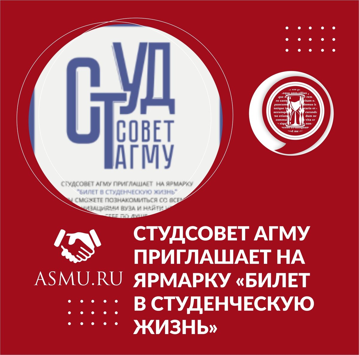 Студенческий совет АГМУ приглашает обучающихся Алтайского государственного медицинского университета на ярмарку "Билет в студенческую жизнь". . "Это действительно уникальное мероприятие для наших студентов, которые хотят в совершенстве овладеть мастерством, - говорит председатель студсовета АГМУ Айдар Ербалин. - На этом мероприятии можно будет ознакомиться со всеми организациями в вузе и найти что-то себе по душе". . NB! Ярмарка пройдет в четверг, 23 сентября, с 15:00 до 19:00 в учебном корпусе на ул. Папанинцев, 126. . Добро пожаловать! . #asmu #агму #студсовет