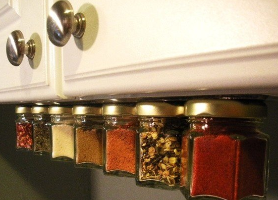 Нет места на кухонных полках, столах и комодах, используйте для хранения специй пространство под мебелью