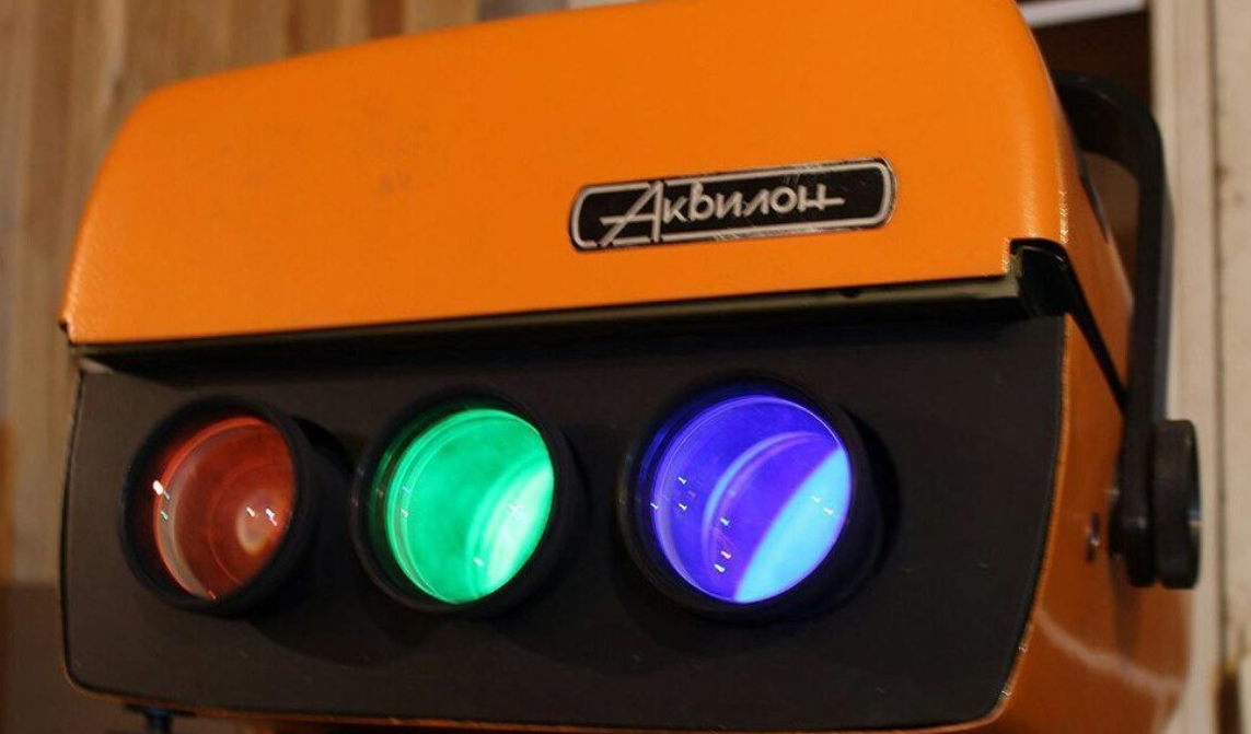 Цветной видеопроектор «Аквилон» разработан в МФТИ и выпускался ограниченной серией с 1991 года. Очень редкий прибор