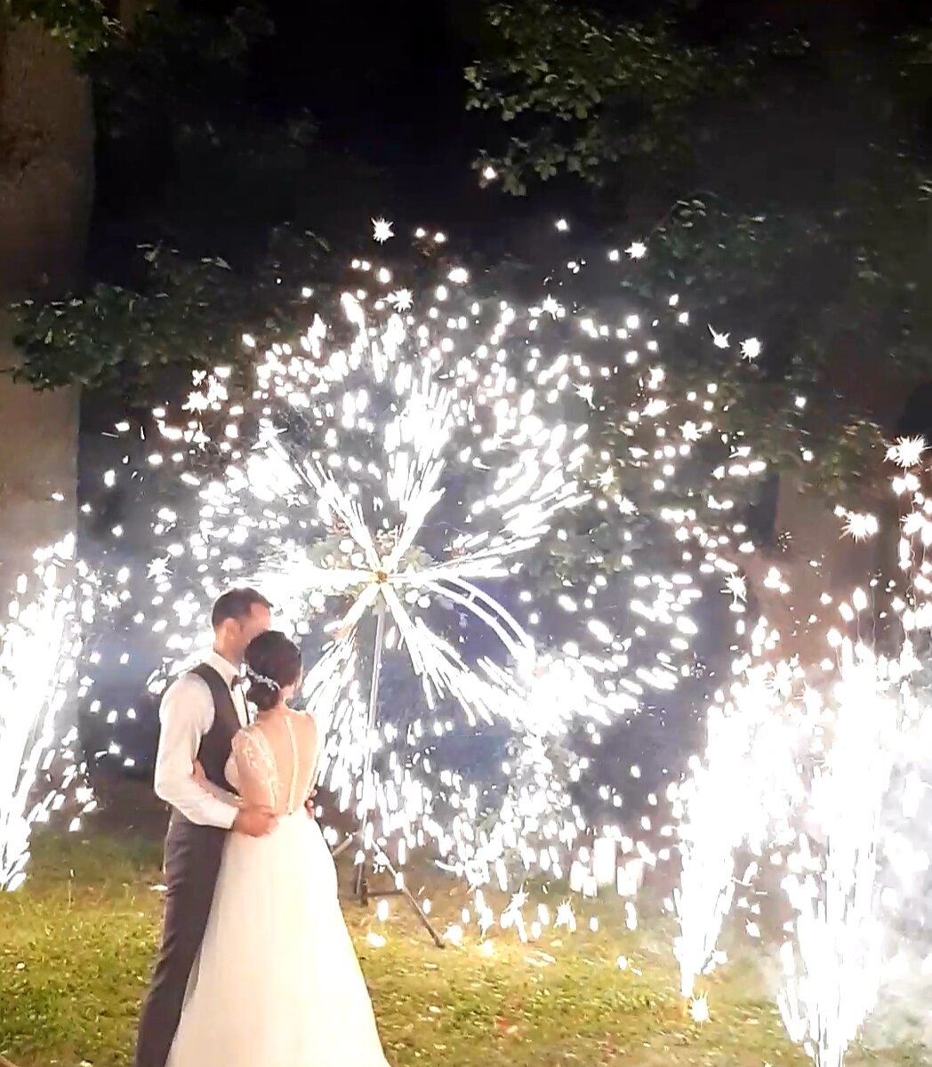 Наткнулась недавно в инстаграм на видео, где загорелась свадебная арка от "холодных" фонтанов. Хорошо, что это было на улице... Жуть! Слава Богу у нас на свадьбах все проходило без пожара!!! После увиденного решила написать про холодные фонтаны, что нужно про них знать перед покупкой или заказом такой услуги. Как бы их не называли "холодными фонтанами", но получить ожог можно. В районе сопла фонтана температура достигает 850-900 градусов. Конечно по сравнению с бенгальской свечой это мало, у свечи 1000-1600 градусов. Но, внутри фонтанов порох и пироэлементы. За счет элементов происходит детонация и искры вылетают до 3-4 метров. Поэтому лучше всегда перестраховаться и не ставить фонтаны рядом с декором , который легко может загореться. Не стоит зажигать в помещении, где много текстиля на стенах и потолке, а особенно в шатрах. И конечно, если вы планируете проходить около фонтанов в момент их горения, то лучше между фонтанами и вами должно быть безопасное расстояние. Так как в бол