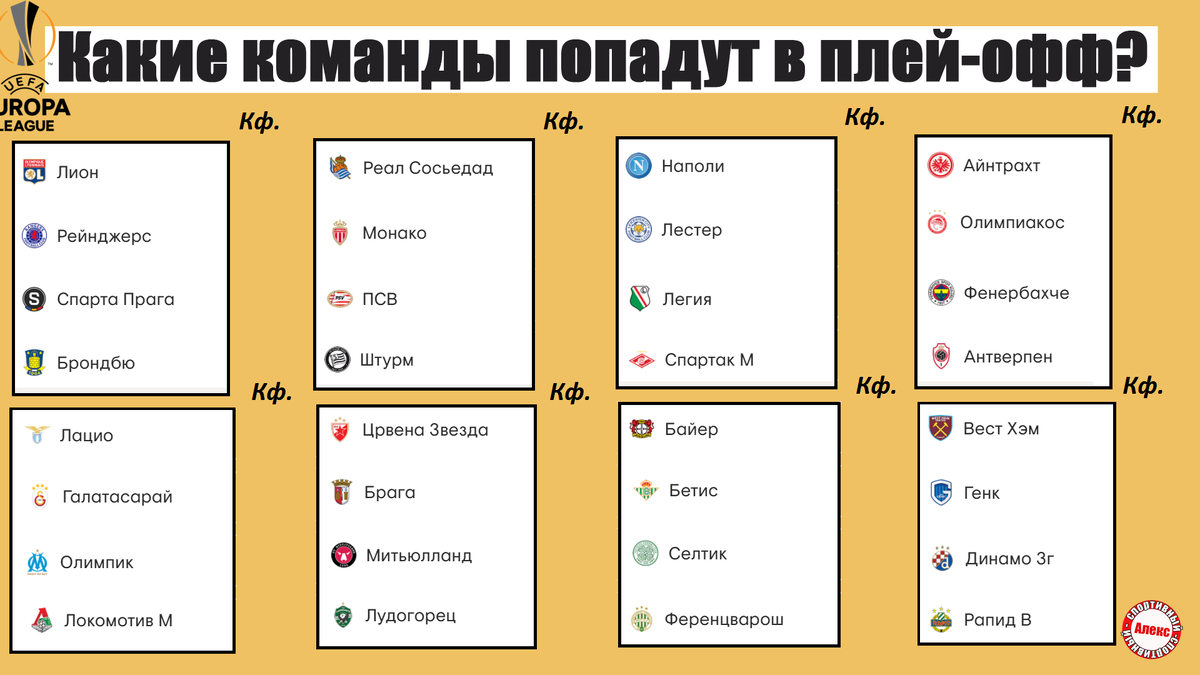 Привет, друзья. Кто выйдет из групп Лиги Европы? Давайте сравним наши ожидания с коэффициентами букмекеров. Из прошлого выпуска мы выяснили, что из Лиги Чемпионов придут сюда 8 команд: Брюгге (Бельгия), Милан (Италия), Спортинг (Португалия), Шахтёр (Украина), Бенфика (Португалия), Янг Бойз (Швейцария), Зальцбург (Австрия), Зенит (Россия). Почему именно эти клубы? Подробнее об этом смотрите выпуск, посвященный Лиге Чемпионов, ссылка внизу. Итак, 8 участников плей-офф нам известны. Состав плей-офф сезона 2021/2022 должен выглядеть следующим образом: Два клуба от Англии: Лестер, Вест Хэм. От Испании выйдут Реал Сосьедад и Бетис. От Италии - Наполи и Лацио. От Германии – Айнтрахт и леверкузенский Байер. 2 клуба по прогнозам получит Франция: Монако, Лион. 6 стран имеют по одному представителю: Рейнджерс (Шотландия), греческий Олимпиакос, Галатасарая (Турция), сербская Црвены Звезды, португальская Брага, бельгийский Генк. Самые высокие шансы на победу в Лиге Европы среди этих команду у На