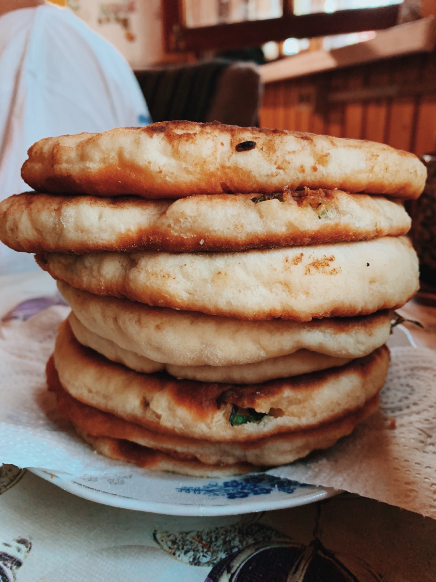 Лепешки с сыром и зеленью на сковороде Ингредиенты: Шаг 1 Замешиваем тесто. Для этого в удобной посуде замешиваем 1 стакан муки с кефиром, солью, содой и сахаром. Делаем это при помощи ложки или лопаточки. Шаг 2 Затем в миску постепенно досыпаем необходимое количество муки, чтоб получить пластичное тесто. Получившееся тесто не должно прилипать к рукам и столу. Шаг 3 Комочек теста укладываем в посуду, накрываем влажным полотенцем и оставляем настаиваться на 30 минут. Шаг 4 В это время займемся начинкой. Сыр натрем на крупной терке, зелень и зеленый лук мелко рубим. Все смешиваем. Шаг 5 Тесто делим на 6 равных частей. Шаг 6 Каждую часть тела раскатываем в большую лепешку. В центр выкладываем начинку. Шаг 7 Залепляем. Шаг 8 Затем сверху проходимся скалкой и раскатываем лепешку до нужного размера. Шаг 9 Лепешки выпекаем на сухой сковородке по 3-4 минуты с каждой стороны. Каждый раз накрываем крышкой. Если лепешка вздулась, то ее следует проколоть ножом или вилкой. Шаг 10 Готовые