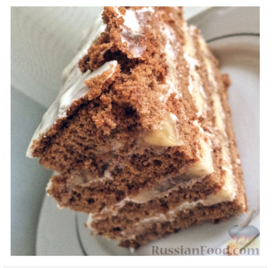 Продукты (на 8 порций) Яйца - 4 шт. Мука - 120 г Сахар - 120 г + сахар для крема Сахар ванильный - 1 ч.л. Разрыхлитель - 1 ч.л. Какао-порошок - 1,5 ст.л. Бананы крупные - 3 шт. Сметана (20% жирности и более) - 1 большая банка Тесто для бисквита: 1. Для начала берём большую ёмкость, в которой будем смешивать все ингредиенты. Разбиваем туда яйца, взбиваем их миксером. 2. Добавляем сахар, ванильный сахар, взбиваем до белой пышной массы. 3. После чего добавляем муку, разрыхлитель и перемешиваем лопаткой или ложкой. 4. После этого добавляем какао и вновь мешаем до тех пор, пока смесь не станет однородной и в ней не останется комочков. Тесто должно напоминать собой густую сметану. 5. После того как тесто готово, берем углубленный противень (либо специальную форму для выпечки бисквитов), кладём туда пергамент - для того, чтобы наш бисквит получился мягким и воздушным и не пригорел к противню. Выливаем туда наше тесто. 6. Отправляем форму с тестом в духовку, разогретую до 180 градусов,