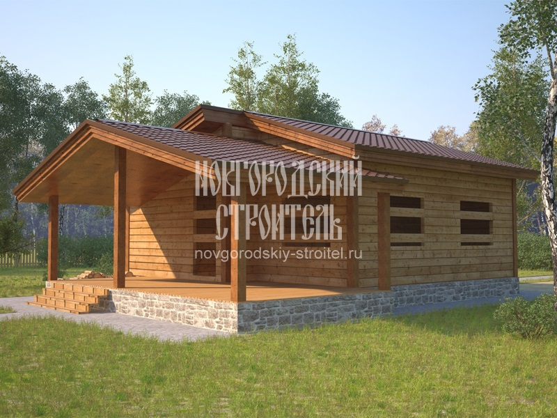 Не совсем обычный по компоновке и внешнему виду сруб с большой верандой понравится тем, кто не любит лестницы и предпочитает хотя бы часть времени проводить на свежем воздухе. Планировка в этом проекте рассчитана не столько на семью, сколько на компанию отдыхающих - именно поэтому спален только две, зато есть большая гостиная-кухня и просторная терраса-крыльцо. Если же дом строится для семьи, можно отдать большую комнату под кухню-студию, а обозначенное на плане как "Гостиная/кухня" помещение разделить на две спальни. В этом случае, кстати, прокладка коммуникаций будет проще. Не слишком тяжелый даже при выборе максимально доступного сечения профилированного бруса - 200х150 мм - этот сруб легко установить на свайно-винтовой или опорно-блочный фундамент. Обвязка оголовков свай или опорных столбов брусом дает хорошее распределение нагрузки от общего веса здания. Рубка стен ведется по технологии "в теплый угол", с утеплением пространства между венцами джутовой лентой. По желанию заказчика,