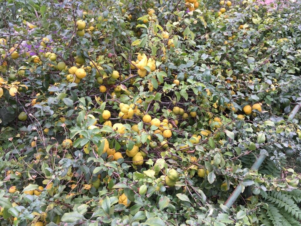 Весной я писала, что такого шикарного цветения садов (и японской айвы), как было в этом году, у нас в Тверской области, пожалуй не припомнят. Однако. Хоть и получила я на ту свою статью огромное (по любым меркам) количество отзывов (комментарии написали почти 500 человек из разных регионов и даже стран), но... Кроме рассказов о сложной, тревожной, пугающей ситуации с пчелами, нашлось и некоторое количество читателей, у которых все в этом году даже намного лучше, чем всегда! И урожай в прямом смысле слова — рекордный. И вот у нас (Тверская область) тоже в этом году есть успехи. Ведь неожиданно отлично созрела японская айва. Вообще-то, айва всегда очень красиво и обильно цветет красными цветочками. Не зря ведь ее сажают даже и просто в декоративных целях. Я давно изучила этот кустарник и приспособилась ежегодно дважды подстригать у японской айвы ветки ножницами с большими ручками (для стрижки кустарников). Не всегда получается подстричь ровно, потому что я стараюсь оставлять те ветки, на