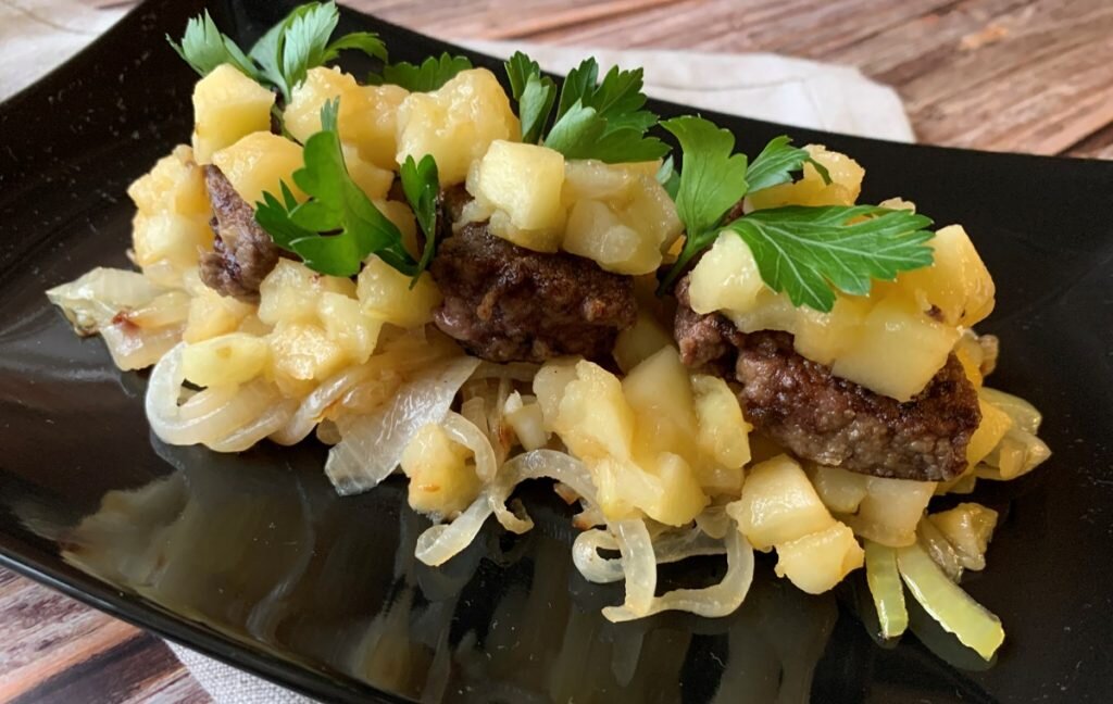 ВАМ ПОНАДОБИТСЯ: ПРИГОТОВЛЕНИЕ 1. Яблоки почистить, нарезать кубиками и притушить на масле Гхи. 2. Лук нарезать полукольцами и обжарить до золотистого цвета. 3. Печень нарезать довольно крупными кусками толщиной 1 см. Посолить, присыпать специями. 3. Обвалять куски печени в муке. Удобнее это делать в пакете — насыпать муку в пакет, положить туда печень и хорошенько встряхнуть. 4. Печень обжарить на сковороде по 2-3 минуты с каждой стороны. Довести до готовности в духовке — 10 минут при 180 градусах. 5. На блюдо выложить кольца лука, затем слой яблок, кусочки печени и оставшиеся яблоки. Украсить веточками петрушки. Приятного аппетита! Автор: Екатерина Остапчук (@katya.radost) Подписывайтесь на наш Телеграм-канал (@strela_coach) и читайте новые статьи! Рекомендации для вас: Рецепт: кексы из печени и гречки Рецепт: салат с уткой Рецепт: перец, фаршированный мясом и рисом Рецепт: куриные грудки в ореховой панировке Рецепт на ужин: кексы из белого мяса птицы Рецепт: курица с фасолью и лимо