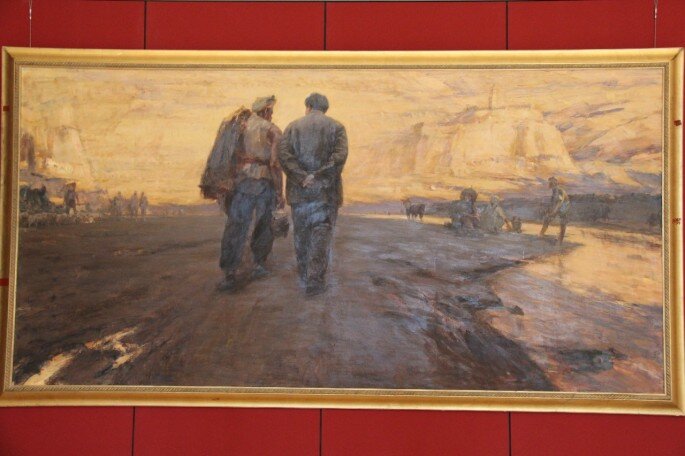 Полотно 180х360 см (!), называется "延河边上", что в переводе с парадного китайского на богатый и могучий звучит как "На берегу реки Яньхэ". Картина 1999 года, художник 钟涵, Чжун Хань (я настаиваю на мягком знаке в конце). Чтоб понять, а кто, собссно, здесь изображен, и почему картина хранится в Национальном музее Китая в отделе современного классического искусства, наберите в поисковике "мао цзе дун яньхэ". Дальше нужно писать про партизанские войны, новую демократию, правильный путь, но мне лень. Давайте о картине, да? У работы славная история. Дело в том, что это - дубликат, нарисованный, однако, автором оригинала. Оригинал же был создан в 1963 году и получил, цитирую, "широкое социальное признание". Но потом была культурная революция, критика, чистка, усушка, утруска, на картине обнаружили "неправильные элементы", и полотно оказалось в немилости. Демонтировали, сняли, сдали и... потеряли! Потеряли картину в шесть с лишним квадратных метров! Это потом выяснилось, что всё это время она хр