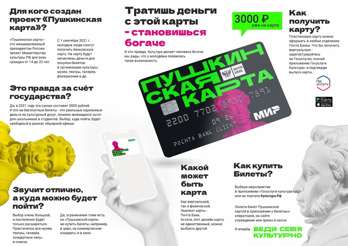 Что такое Пушкинская карта? С 1-го сентября 2021 года молодые люди от 14 до 22 лет смогут приобрести Пушкинскую карту. Создание данного государственного проекта было направлено на культурное просвещение молодежи страны. В этом начинании мы, конечно, очень поддерживаем наше правительство. Как отметила вице-премьер Татьяна Голикова, сегодня в нашей стране около 13 миллионов потенциальных участников этой программы. «Пушкинская карта — проект, направленный на то, что бы молодежь нашей страны могла за счет государства посещать различные культурные мероприятия. Те молодые люди, у которых будет Пушкинская карта, смогут оплачивать с нее посещение различных культурных мероприятий. Это могут быть походы на экскурсию, на концерт, в театр.»© Итак, немного разобрались, что это такое. Давайте перейдём к более важным деталям. Как оформить Пушкинскую карту? Молодые люди от 14 до 23 лет смогут оформить Пушкинскую карту. Для этого вам понадобится приложение «Госуслуги Культура». (Можно, конечно, офо