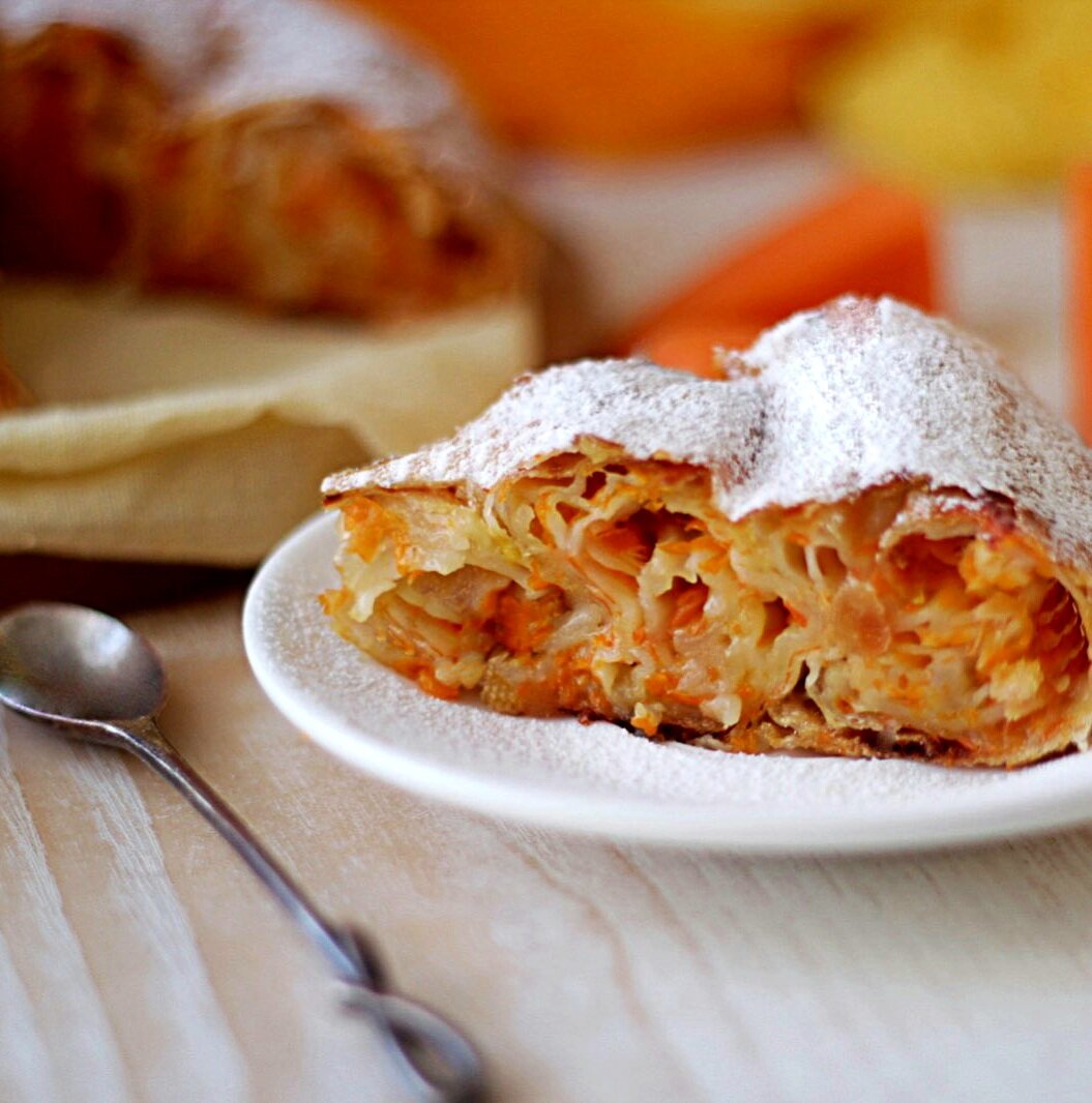 Ингредиенты: Тесто: Начинка: Способ приготовления: 1. Для теста отделить белок от желтка, белок — в тесто, а желток — для смазывания вертуты перед выпечкой. К белку добавить воду, соль и растительное масло, хорошо перемешать венчиком. 2. Добавляя понемногу просеянную муку, замесить тесто. Вот такое оно сразу после замеса. 3. Вымешивать тесто около 10 минут, оно должно быть гладким, однородным, очень пластичным, не должно липнуть к рукам. Тесто завернуть в пищевую пленку и дать ему отдохнуть 20 минут. 4. В это время готовим начинку. Тыкву промыть, срезать кожуру и натереть на крупной терке, добавить сахар по вкусу. Дать постоять минут 10 и хорошо отжать сок. 5. Берем наше тесто и делим на 2 части (из указанных ингредиентов получается 2 небольшие вертуты). Сначала раскатываем в пласт, потом аккуратно поднимаем, помещаем в середину под пласт теста свои кулачки и начинаем их разводить в разные стороны, растягивая тесто. Делать это нужно очень аккуратно, чтобы не порвать пласт. 6. Как толь