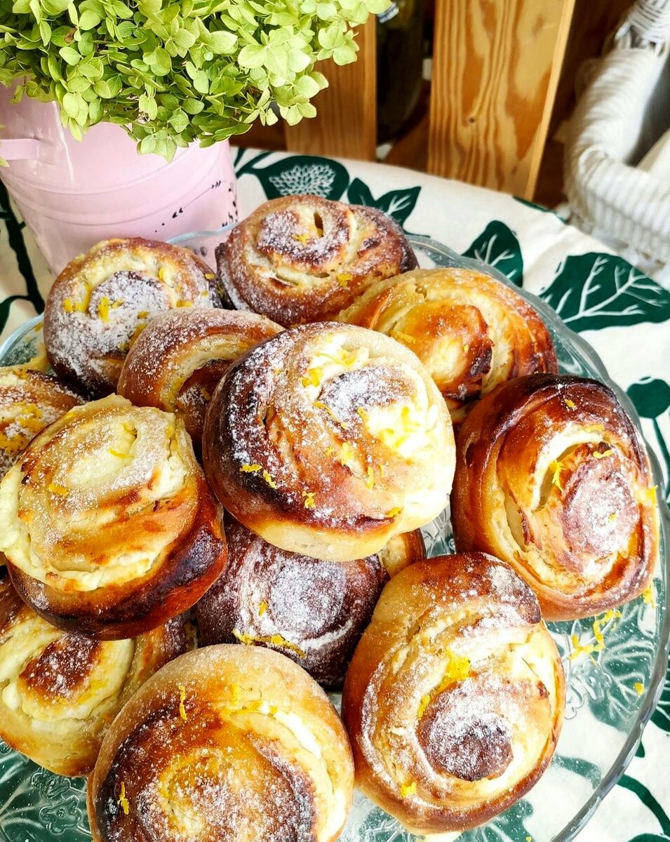 Ингредиенты: Способ приготовления: 1. Для теста нам понадобится теплое молоко, в которое мы добавляем дрожжи, ванильный сахар, растительное масло, щепотку соли, мед и сахар. Все хорошо перемешиваем. Далее начинаем добавлять просеянную муку. Вымешиваем тесто, накрываем пленкой и убираем в теплое место на 1 час. 2. Творог взбиваем блендером с 3 ложками сахара, трем лиммоную цедру на мелкой терке и отправляем к творогу. Подошедшее тесто раскатываем в пласт шириной примерно 2–3 мм, выкладваем нашу массу и сворачиваем в рулет. Нарезаем на небольшие кусочки, выкладываем на противень, на котором уже лежит пергамент, смазанный сливочным маслом. Накрываем полотенцем и даем еще постоять 25 мин. Смазываем булочки желтком и отправляем в духовку, разогретую до 180°C, на 25–30 минут. 3. Готовые булочки посыпаем пудрой и лимонной цедрой. Они получается такими мягкими и ароматными, что это просто сплошное наслаждение! Приятного аппетита!