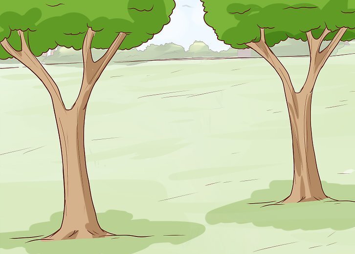 Найдите сухое ровное место между двумя ветвистыми деревьями. Осмотритесь, чтобы найти относительно ровную площадку с деревом, ствол которого поднимается примерно на 1–1,5 м над землей. Если возможно, найдите два дерева, ствол которых разветвляется на высоте 1–1,5 м над землей и находится на расстоянии около трех метров друг от друга.