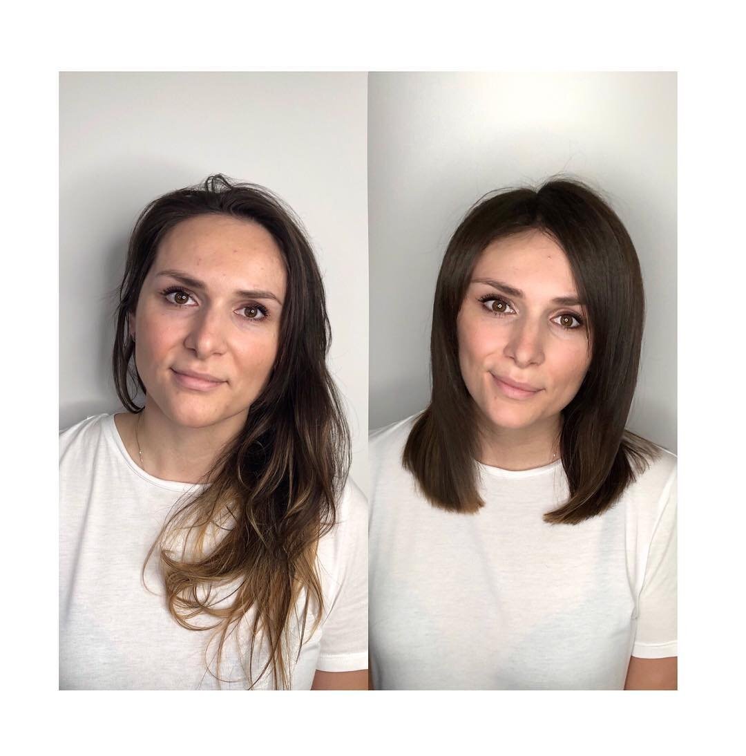 Стрижка и окрашивание волос способны очень сильно изменить внешность. Зная некоторые нюансы можно легко визуально помолодеть лет на 10. Именно такие примеры преображения покажем в сегодняшней статье. Часто говорят, что длинные волосы делают внешность более моложе, но есть масса примеров того, как после стрижки визуально улучшается очертания лица. Многие с помощью стрижки скрывают отечность, второй подбородок и другие недостатки. Сделав объемную высокую стрижку можно визуально вытянуть овал лица: Следующий простой трюк, чтобы выглядеть моложе с помощью прически - сделать оттенок волос однородным. Если оттенок будет натуральным, то это самый универсальный вариант с которым тяжело ошибиться, просто нужно подобрать краску, оттенок которой близок к вашему. Можно, конечно, и другие оттенки, если вас не пугает постоянное поддерживание нового цвета. Еще один хороший пример, как однородный натуральный оттенок меняет внешность к лучшему. Наверняка даже если челка снова выбьется вперед пос