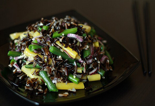 1.Залить 1 ½ стакана дикого риса 4 стаканам чуть подсоленой воды, довести до кипения, после убавить огонь и томить около 40-50 минут. Он должен стать мягким и большинство рисинок «откроются». 2.В идеале рис надо замочить на час-два в горячей воде и варить уже с 3мя стаканами воды те же 40-50 минут. 3.Фасоль (зеленую и желтую) отварить в воде не более 5 минут или приготовить в пароварке. 4.Чеснок порубить как можно мельче или выдавить с помощью давилки. 5.Лук нарезать тонкими полукольцами. 6.С лимона снять цедру и выдавите сок. Смешать чеснок, цедру, сок ½ лимона с кунжутным маслом. 7.Заправить получившемся соусом рис и фасоль. 8.Подавайте горячим с соевым соусом! 9.Можно добавить кусочки козьего сыра или моцареллы. 10.Употребляйте с наслаждение и, по возможности, палочками :) Много статьей и интересных знаний вы найдете на сайте vedenie.com