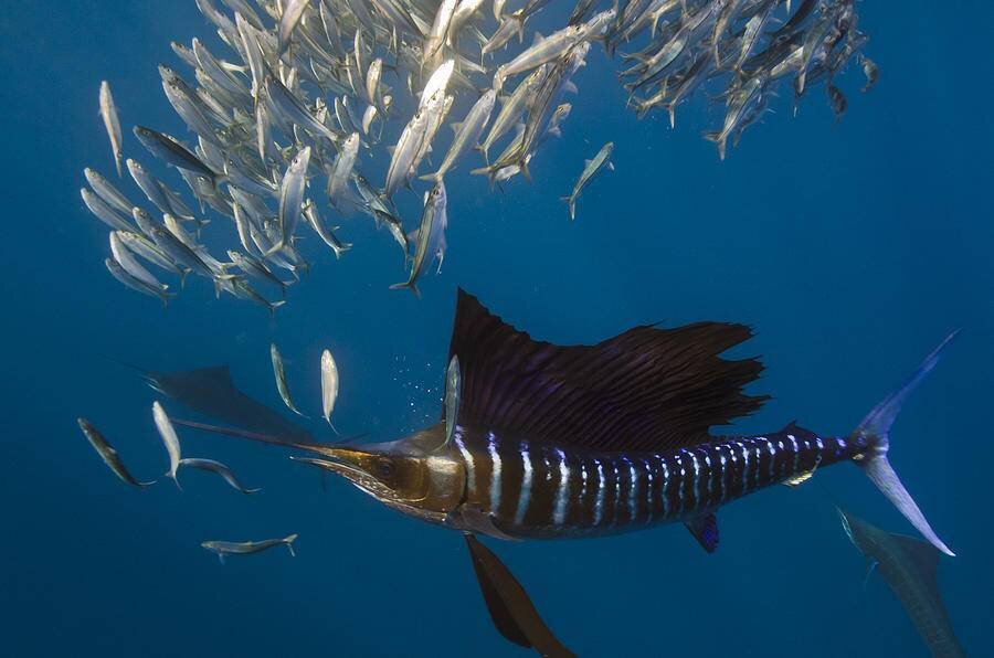 1. Парусник Индо-тихоокеанский парусник (Istiophorus platypterus) - парусник, обитающий в Атлантическом, Индийском и Тихом океанах. Они питаются тунцом и скумбрией, одной из самых быстрых рыб в океане. Некоторые авторитетные источники признают только один вид парусника - I. platyperus. . Многие эксперты считают парусных рыб самым быстрым морским существом. Определить скорость морских животных непросто, поэтому не все согласны с таким открытием. Морской парусник быстро растет, достигая длины 1,2–1,5 м в течение года, и питается на поверхности или на средней глубине более мелкими пелагическими рыбами и кальмарами. По оценкам, максимальная скорость плавания парусников составляет 35 м / с (130 км / ч). Как правило, парусник не достигает более 3 метров в длину и редко весит более 90 кг. Было идентифицировано два вида парусника, но не было обнаружено различий в мтДНК, морфометрии или меристии между двумя предполагаемыми видами, и большинство авторитетов теперь признали только один вид (Isti