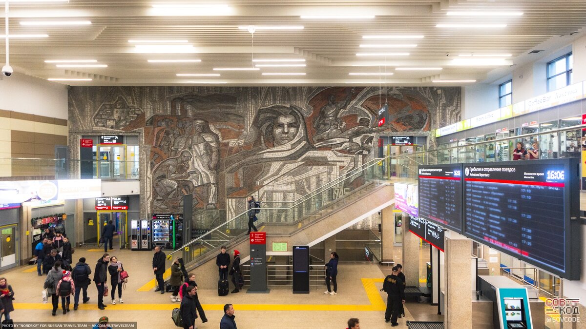 Любопытно, что изначально холл Московского Вокзала украшала Волга, Стрелка на одной стене и пара рабочего с колхозницей, на другой. Но затем пришло распоряжение сверху сделать революционный сюжет, мозаику скололи и работы начали заново.