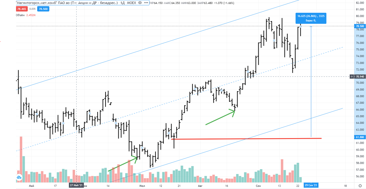 В продолжение предыдущей статьи приведу пример правильного, на мой взгляд, отношения к дивидендам на примере реальных сделок с реальным инструментом. В недавнем прошлом была сделана глупость и позиция по ПАО "ММК" была закрыта. Поиски точек входа в соответствии с торговой стратегией привели к сделкам в точках, указанным на рисунке ниже зелеными стрелками. Средняя цена инструмента отмечена красной горизонтальной линией. Объявленные дивиденды за 1 полугодие текущего года составят 3,53 рубля или 5,7% к средней цене покупки. Рост инструмента за период с июня до конца сентября около 27%. Дивидендный геп и возможное дальнейшее снижение цены (по моей оценке наиболее вероятно в район 70 рублей) я буду воспринимать как повод нарастить позицию в инструменте. Посмотрев на цену инструмента на момент написания статьи (середина дня 23.09.2021), можно придти к выводу что бумагу продолжают покупать. По моему мнению покупают люди, желающие 24.09.2021 попасть в реестр акционеров для выплаты дивиденд