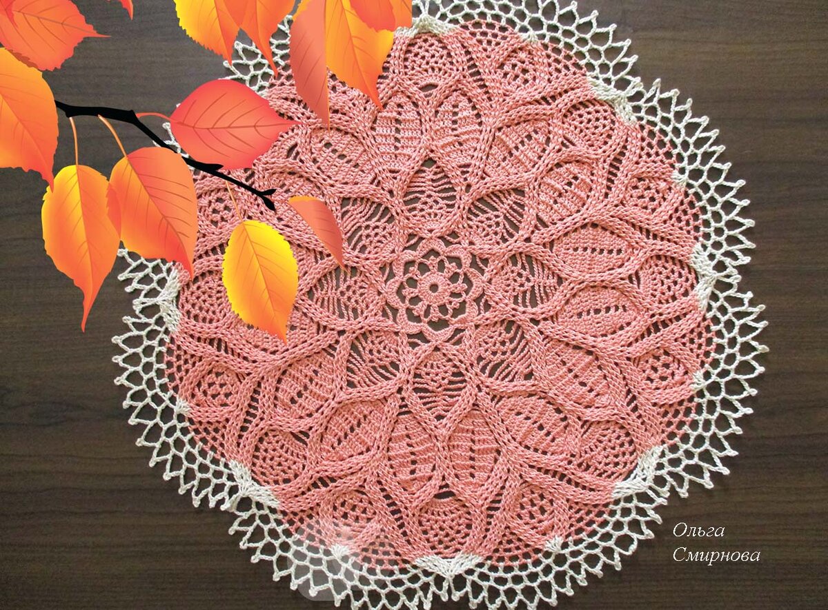 Салфетка крючком с рельефными листочками получилась очень красивая, как раз к теме осени. Диаметр ее 40 см. Одного мотка ниток YarnArt Violet (грязно - розовый цвет) не хватило на три последних ряда и поскольку не удалось купить такого тона, довязала бежевыми. Получилось неплохо, нежно, как будто так и задумано )). Мне очень нравится, как она выглядит на столе, рельефные листочки создают интересный эффект. Кстати, у нас есть уже салфетка с очень похожими объемными листочками, но другая и маленькая. А это как ее старшая сестра )). Вязать не сложно, в процесс работы она, конечно, будет немного стягивать, все же рельефные столбики короче обычных, но на блокировке все чудесно выровняется. Схема осенней салфетки с рельефными листочками К сожалению, изображение не очень четкое, но тут все довольно просто и понятно. А если возникнут сложности, обращайтесь к моему мастер классу, который опубликован на канале youtube.