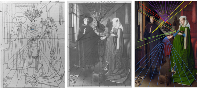 Однако в знаменитой картине «Портрете четы Арнольфини» невозможно найти единую точку схода — точку, наиболее удаленную от зрителя, где встречаются все параллельные линии картины.