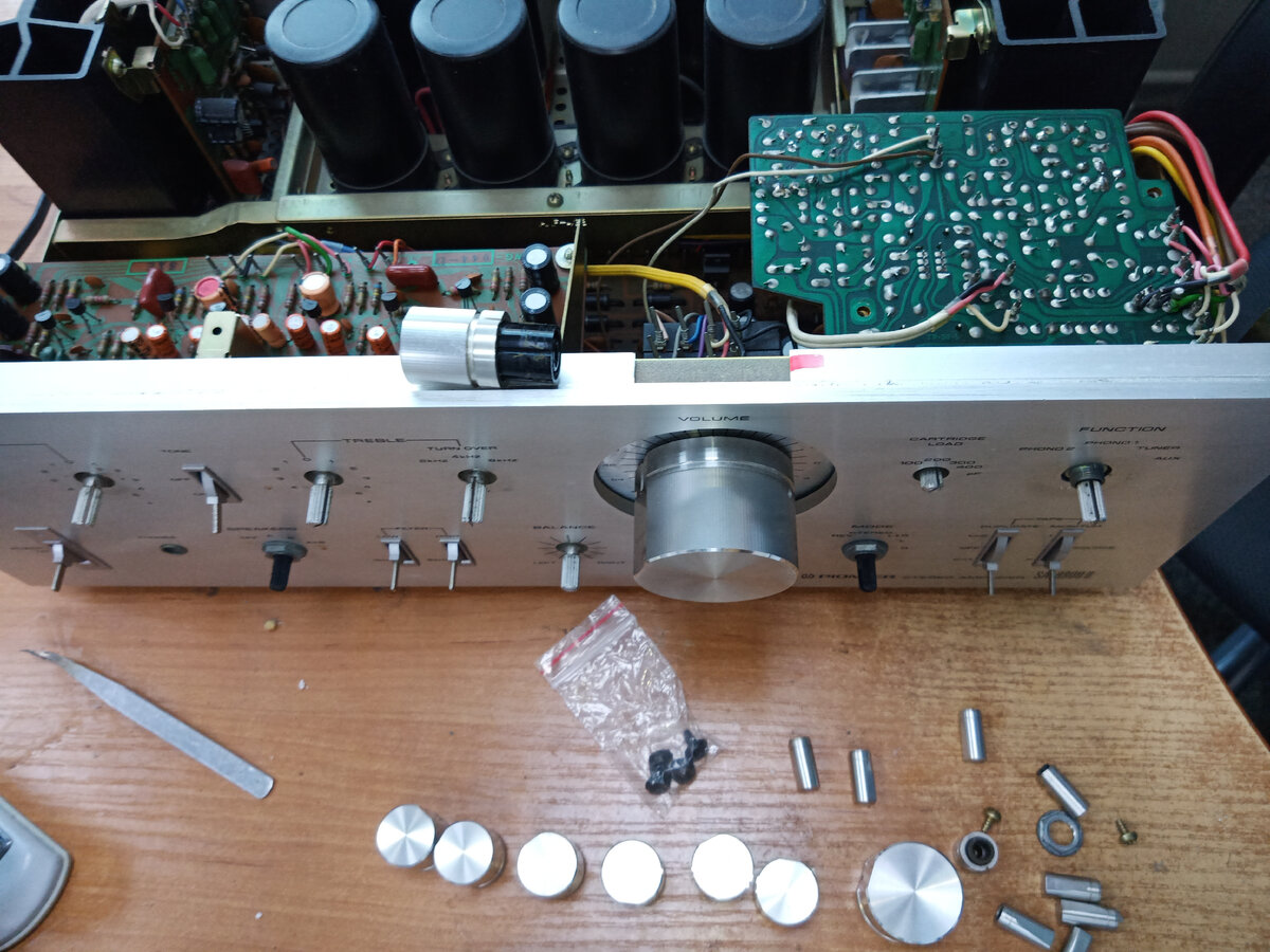 В первой части статьи я описал процесс разборки усилителя. Честно говоря, взялся за это дело надеясь на то, что неисправность примитивная - аппарат щелкал, пропадал канал. По схеме и внешнему виду модель 8800II идентична 8500II. Первая мысль - "убитый селектор каналов" , оказалась правильной. Но... Но по порядку. Промыть на плате деталь нереально. Снять селектор не так просто. Надо снять переднюю панель, снять блок эквалайзера (фонокорректора), удалить припой с десятка контактов и т.п. Откручиваем винтики и осторожно разбираем. Запоминаем положение составляющих и ловим два шарика (расположены в носовой части). Мой оказался весь в каком-то налете. Для начала я все капитально промыл FLUX-OFF. Контакты поджал и пропаял заклепки - соединение контактов с дорожками платы. Но самая засада - центральный, вращающийся контакт. Он представляет собой диск из тонкого проводящего материала. По кромке контактирует с контактом платы. За годы эксплуатации эта кромка стирается и ремонту не подлежи