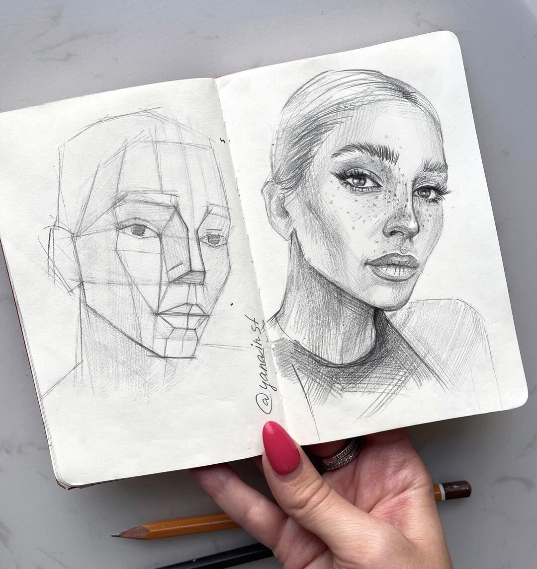 ТРИ ЧЕТВЕРТИ — САМОЕ СЛОЖНОЕ ПОЛОЖЕНИЕ ГОЛОВЫ В РИСОВАНИИ ПОРТРЕТОВ. За несколько лет обучения рисованию портретов я убедилась, что такой урок дает сложнее всего. Поэтому подготовила для вас специальную статью. Поехали! В этом ракурсе особо важно понимать, из каких объемных форм состоит человеческое лицо. В этом вам поможет ОБРУБОВКА! Сейчас же гуглите, как выглядит ее 3D модель. Обрубовка показывает основные ракурсы, их еще можно назвать планы или плоскости, в данном случае, головы человека. Такой макет очень хорошо помогает при создании как академического , так и fashion портрета. В этом уроке мы будем разбирать, как рисовать fashion портрет в три четверти. Его сможет повторить каждый, поэтому скорее берите карандаш, бумагу и ластик! ▫️На старте рисования обязательно отмечайте границы будущего рисунка. ▫️Рисуя вспомогательные линии, не давите слишком сильно на карандаш.⠀ ▫️Для того, чтобы портрет был реалистичнее и объемнее, прорисовывайте более детально и контрастно те участки, ко